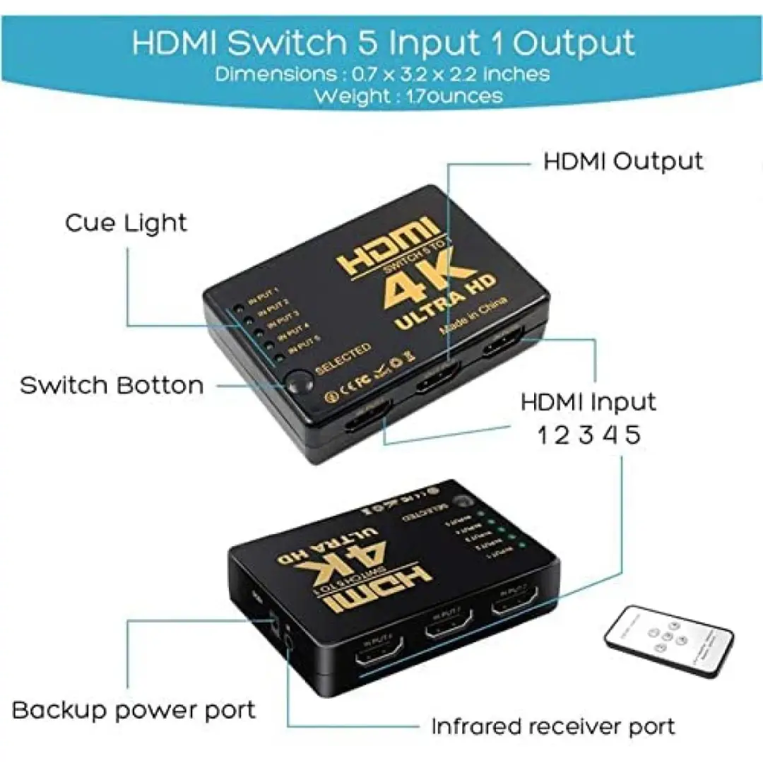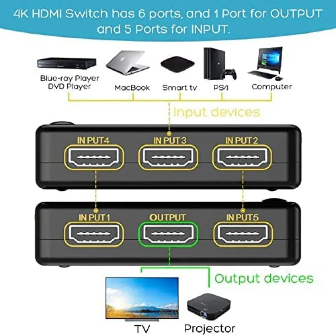 4K HDMI Switch, 5 input ports, and 1 output port. You can connect 5 HDMI sources to 1 HDMI display or connect 1 HDMI source to switch between 5 displays.