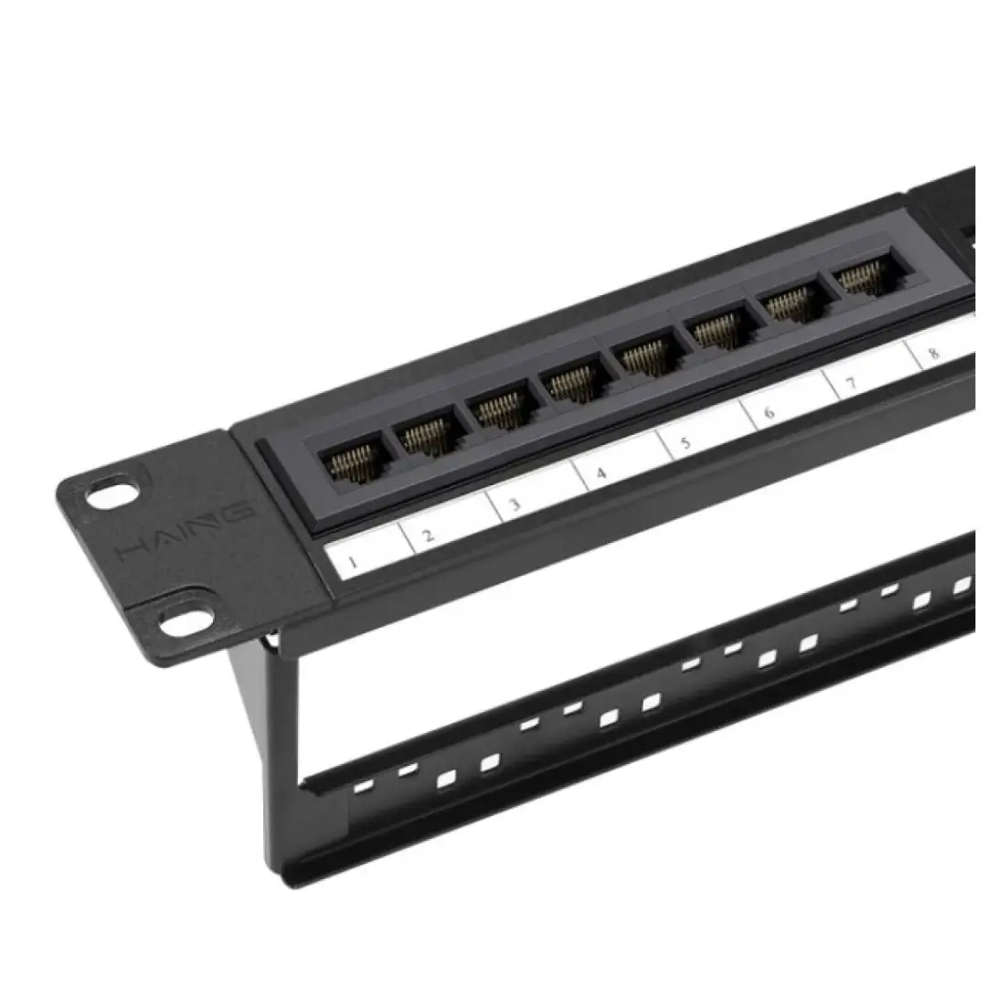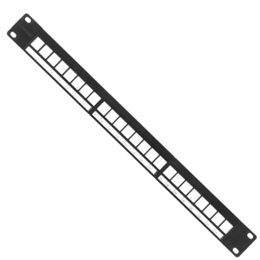 Heavy duty 24 port patch panel supports Ethernet, made for Cat 6 cabling, but backwards compatible with Cat 5e and Cat 5 cabling.