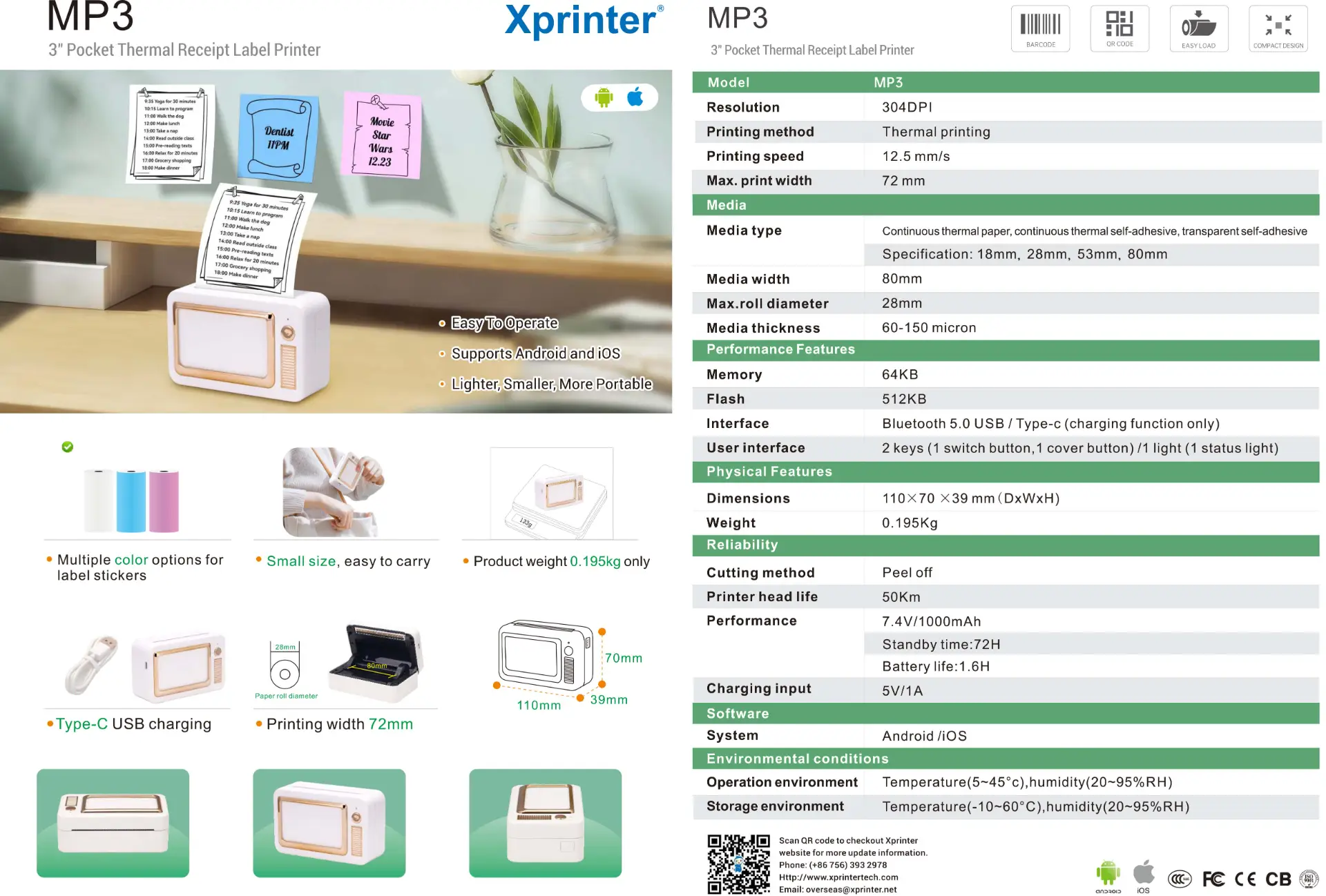 XPrinter MP3 Portable Pocket Thermal Label Printer
