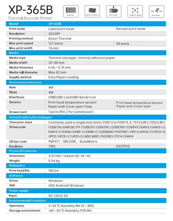 Max.print speed:127 mm/s Label/220 mm/s Receipt