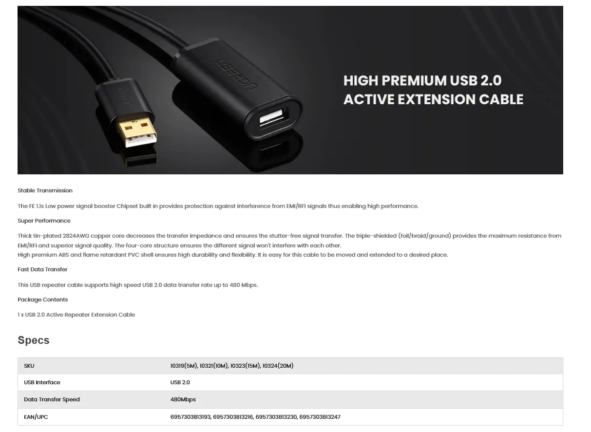 Computer Masters - UGREEN US103 USB 2.0 Active Extension Cable