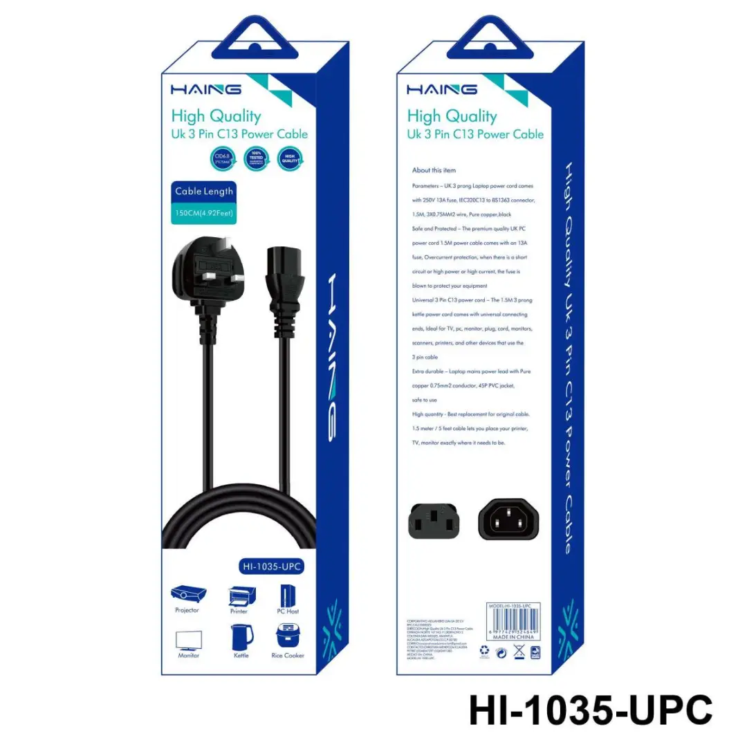 Safe and Protected _ The premium quality UK PCpower cord 1.5M power cable comes with an 13Afuse, Overcurrent protection, when there is a shorcircuit or high power or high current, the fuse isblown to protect your equipment