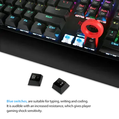 Customized mechanical blue switches make it possible for 50 million times keystrokes and fast responsiveness. Mechanical keys can provide all-around gaming experience for players with medium resistance, nice click, and quick feedback.