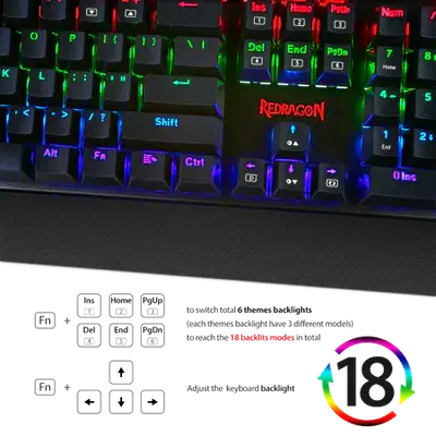 RGB adjustable LED backlights offer 6 backlight themes and 18 backlight models. Player can press โFNโ+ Ins, Home, PgUp, Del, End and PgDn to change as they like.