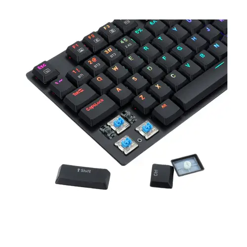 Compact Low Profile Tenkeyless Gaming Keyboard with 87 keys; dust proof mechanical switches. Linear switches clicky medium resistance audible loud click sound crisp precise tactile feel good for typing and gaming
