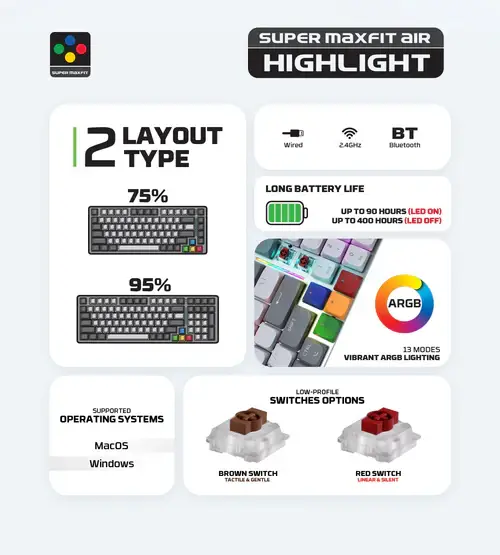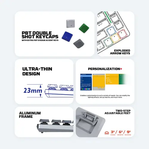 75% Layout with exploded arrow keys design: This compact 75% layout, featuring exploded arrow keys, offers a streamined and efficient design that saves desk space with maintaining essential functionality.