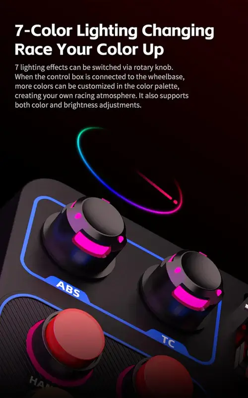 5. RGB lighting changes: The knob allows you to switch between seven lighting effects. When connecting to the racing base, you can customize other colors from the palette to produce an immersive racing atmosphere. It also supports adjustment of the lighting color and brightness, so that you can feel the different happiness of the game.
