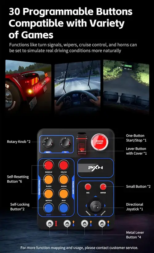 1. Compatibility: PXN CB1 racing button box is compatible with the PC and PXN V9 Gen2 steering wheel. It has plug -in functions and supports various popular racing simulators. It is seamlessly connected to Assetto Corsa, Iracing, Project Cars, Euro Truck Simulator 2 and American Truck Simulator to ensure that you can play its functions to the greatest extent and significantly enhance your game experience on different platforms.