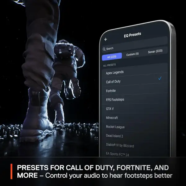 PRESETS FOR CoD, FORTNITE, AND MORE – Control your audio using the mobile app to hear footsteps better in game. Unlock total audio control with 200+ game presets in the Arctis Companion.