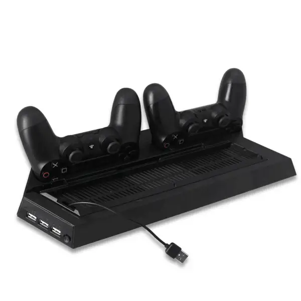 The stand has 2 built-in charging stations for controllers,which charge your controllers simultaneously when having your PS on, super simple but it is very efficient.