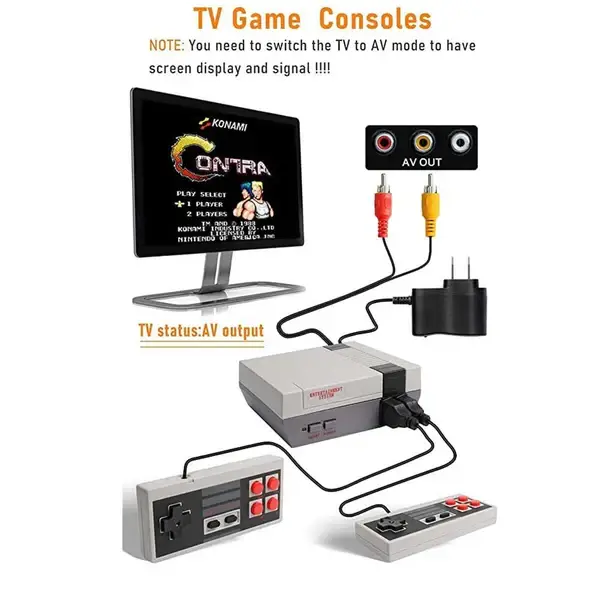 Connect to your TV via AV out. 8-bit Video game picture quality is not as clear as today's games. But many classic games are still fun and very challenging.๏ผdon't work with HDMI๏ผ