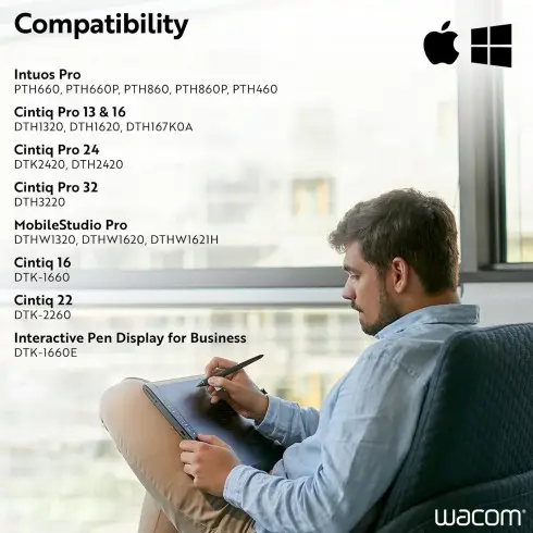 Not compatible with Wacom Cintiq Companion (DTHW1300), Cintiq Companion Hybrid (DTHA1300), Cintiq Companion (DTHW1310), Cintiq Displays (DTK1300/DTH1300K/DTK2200/DTH200) , Intuos (CTH490) and Intuos Pro (PTH451/PTH651/PTH851)